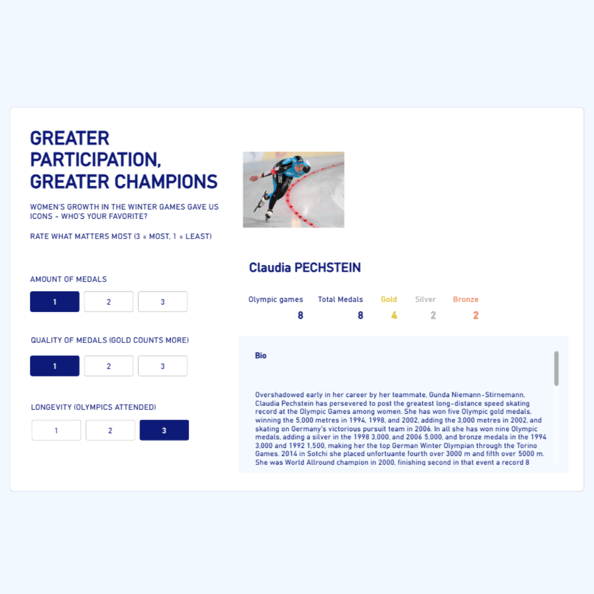 I avslutningen løftet han perspektivet fra ren statistikk til faktisk effekt, ved å fremheve kvinnelige utøvere som har utmerket seg etter hvert som mulighetene har blitt større. Her brukte han en interaktiv modell der publikum selv kunne justere hva som vektlegges i vurderingen av «Greatest of All Time» som medaljekvalitet, antall eller karrierelengde og dermed se hvordan rangeringen endrer seg.