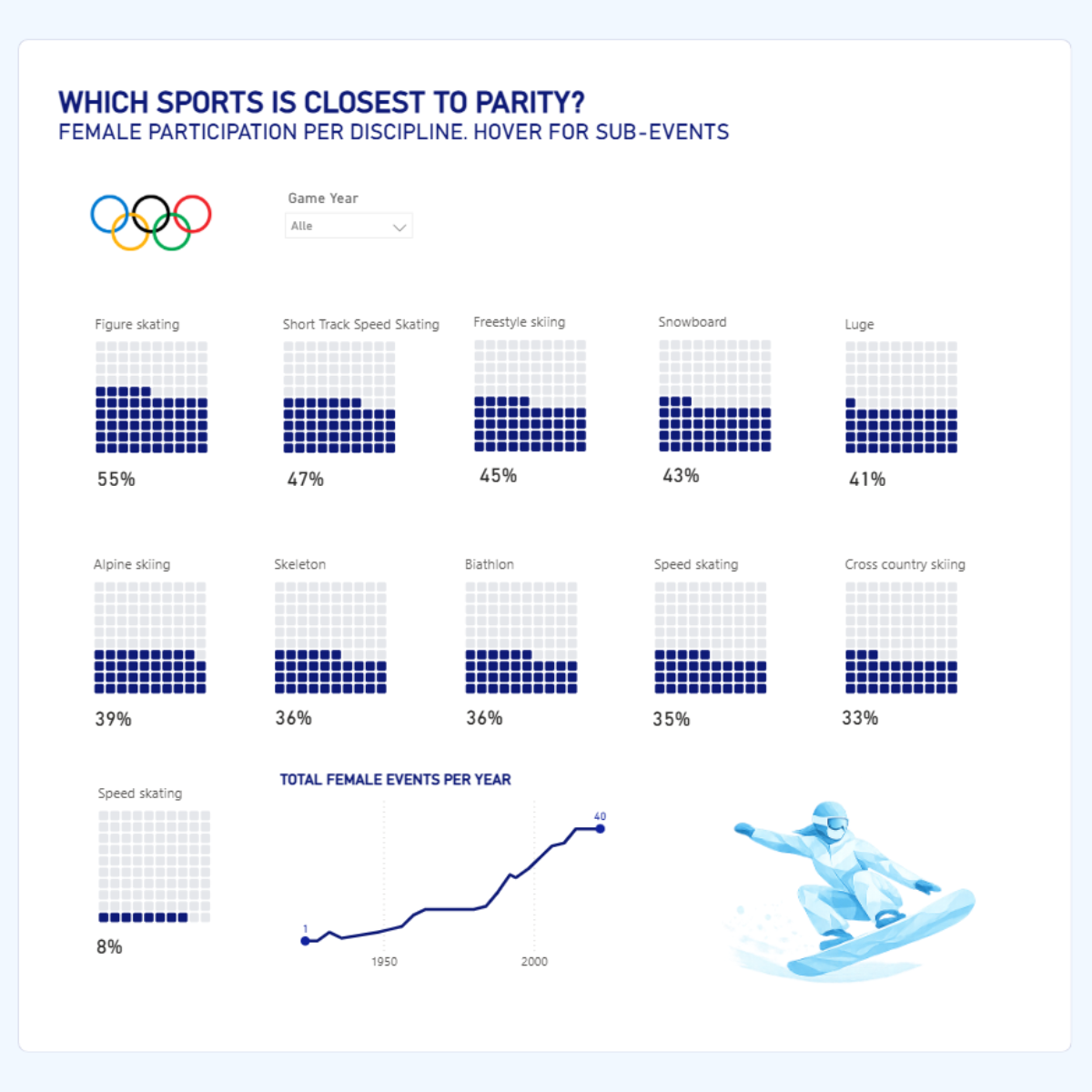 Rapporten startet med å vise hvordan kvinners deltakelse har utviklet seg fra starten av vinter-OL til i dag, der trenden er tydelig: Vi har gått fra svært lav representasjon til nesten lik fordeling mellom kjønnene. Deretter analyserte han hva som har bidratt til denne utviklingen gjennom en tidslinje med sentrale milepæler og programendringer.
