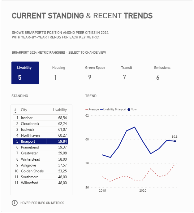 I denne oppgaven skulle deltakerne analysere hvordan byen Briarport scorer på «Livability» sammenlignet med andre byer, og identifisere hvilke faktorer som påvirker livskvaliteten mest.